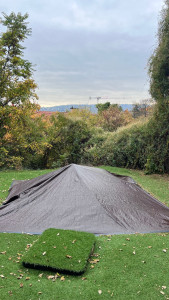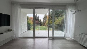 A lakáshoz tartozik egy déli fekvésű gyönyörű nagy terasz, amiről a kertbe érkezünk. A medence nem közvetlen a terasz mellette, hanem a saját kertrészben a telek végén található, intim környezetben. A medence átmérője 2,5m vízmagassága 80cm, és masszírozó vízsugarakkal lett kialakítva.