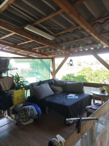 Terasz a bejáratnál, mely a ház hátsó részén található, így a kert felé néz