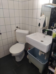 Félemeleten: Előszoba - konyha - nappali egyben, külön egy zuhanyzós fürdőszoba