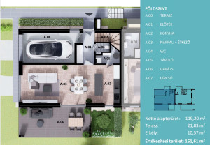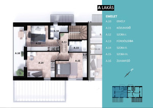 A/2: 108nm +37nm terasz, Nappali + 4 hálószoba, 280nm-es kert, 2 felszíni beálló- 199,9Mft.