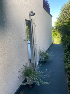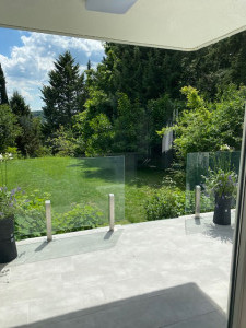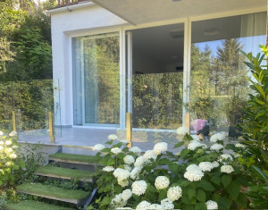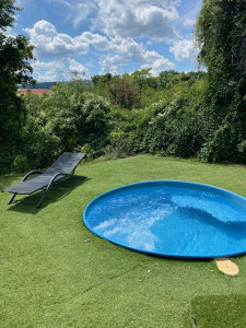 A lakáshoz tartozik egy déli fekvésű gyönyörű nagy terasz, amiről a kertbe érkezünk. A medence nem közvetlen a terasz mellette, hanem a saját kertrészben a telek végén található, intim környezetben. A medence átmérője 2,5m vízmagassága 80cm, és masszírozó vízsugarakkal lett kialakítva.