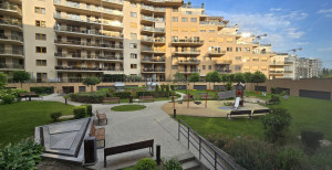 A zárt belső udvarban a lakók számára park és játszótér is található.